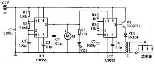 IC1、IC2選用兩塊時(shí)基電路CB555,或選用一塊雙時(shí)基電路CB556。注意,CMOS時(shí)基電路CB7555或CB7556因驅(qū)動(dòng)電流較小,不適合本機(jī)使用。開(kāi)關(guān)管VT選用2SC2073等中功率管。二極管VD2選用FR104等快恢復(fù)整流管。風(fēng)扇M可選用12V、150mA左右的計(jì)算機(jī)CPU用的散熱風(fēng)扇,其體積較小、厚度薄、噪聲很低,比較適合本制作使用,也可用12V玩具電機(jī)配以自制的風(fēng)扇葉片代用。