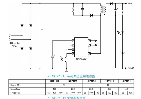以 NCP101x 為例,這系列器件集成了固定頻率電流模式控制器及典型導(dǎo)通阻抗為 11 或 22 ? 的 700 V MOSFET,提供構(gòu)建強(qiáng)固及低成本開關(guān)電源所需的全部特性,包括軟啟動(dòng)、頻率抖動(dòng)、短路保護(hù)、跳周期、最大峰值電流設(shè)定點(diǎn)及動(dòng)態(tài)自供電(不需要輔助繞 組)等。在正常負(fù)載工作期間,NCP101x 以 65、100 及 130 kHz 中的某一頻率開關(guān);而當(dāng)電流設(shè)定點(diǎn)降到低于某個(gè)給定值(如輸出功率需求消失)時(shí),NCP101x 自動(dòng)進(jìn)入所謂的跳周期模式(在此模式下跳除不需要的開關(guān)周期),從而提供極佳的輕載能效。由于進(jìn)入跳周期模式通常發(fā)生在最大峰值電流的 1/4 時(shí),故沒有可聽噪聲產(chǎn)生。因此,待機(jī)能耗降至最低,且沒有可聽噪聲產(chǎn)生。NCP101x 典型應(yīng)用電路及不同型號(hào)的關(guān)鍵參數(shù)參見圖 2。