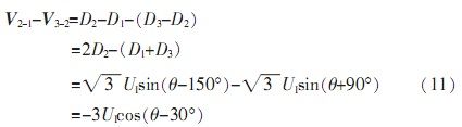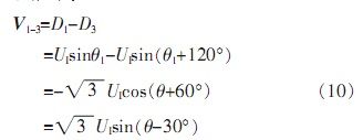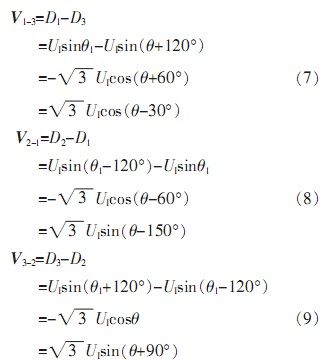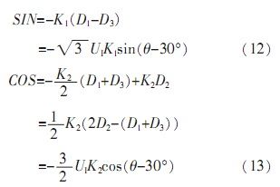 由于自整角機(jī)中定子繞組為星型連接,彼此在空間上呈120°,并且輸出三路定子繞組電壓D1、D2、D3是相對(duì)于中心點(diǎn)而言,無(wú)法對(duì)其單獨(dú)處理。由公式(5)可知,其任意兩線間電壓為: