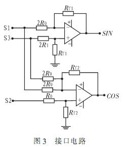 由加法和減法的運(yùn)算電路可知,式中,通過(guò)電阻的阻值設(shè)定,可以得到所需的信號(hào)幅值。SIN和COS兩路信號(hào)就是所需的兩路正交信號(hào)。如將電路稍作修改,亦可應(yīng)用于旋變信號(hào)的處理。