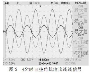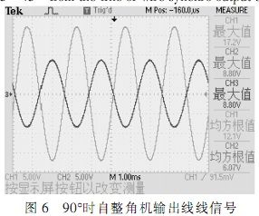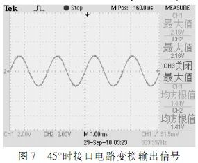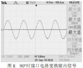 根據(jù)圖中所示,在確定的角度下,自整角機(jī)三路線線信號(hào)在電壓上呈120°正弦關(guān)系,接口電路轉(zhuǎn)換輸出信號(hào)為兩路電壓正交信號(hào),根據(jù)角度不同,兩路信號(hào)電壓峰值不同,單路最大時(shí)電壓為2Vrms。測(cè)試結(jié)果完全符合設(shè)計(jì)要求。