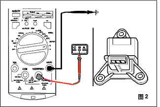 2.關(guān)閉點火開關(guān),斷開傳感器的電子連接接頭。黑色表筆插到儀器的“OUTPUT—”的插孔,另一端搭鐵(使用鱷魚夾),紅色表筆插到“+OUTPUT”插孔,另一端與傳感器的輸入信號線連接(可以使用萬用測試線),如圖2所示。