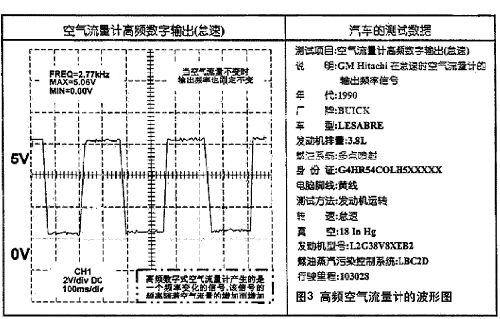 高頻數(shù)字式空氣流量計出現(xiàn)在通用汽車3.8L V6型發(fā)動機上,它是日立(Hitachi)生產(chǎn)的傳感器。此外,高頻數(shù)字式空氣流量計還應(yīng)用于凌志(Lexue)以及其它汽車中。傳感器的脈沖大多數(shù)幅值為5V,怠速時頻率:2.77kHz。