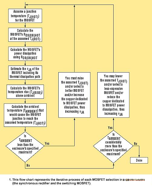 再參考圖1說明,確定是否正確選擇了用于同步整流器和開關(guān)MOSFET的MOSFET迭代過程的下一個(gè)步驟。這一步驟計(jì)算每個(gè)MOSFET的環(huán)境空氣溫度,它可能導(dǎo)致達(dá)到假設(shè)的MOSFET結(jié)溫。為此,首先要確定每個(gè)MOSFET的結(jié)與環(huán)境間的熱阻(ΘJA)。