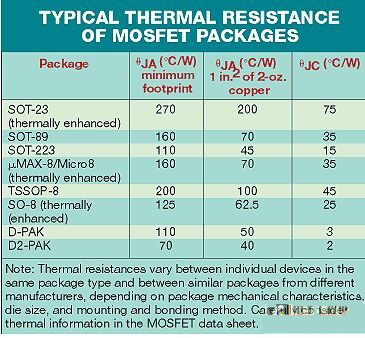 例如,采用1平方英寸的銅片,D-Pak的ΘJAD-Pak可能是50°C/W。但如果銅片就設(shè)在封裝引腳下,ΘJA值將會(huì)加倍(參見表)。采用多個(gè)并聯(lián)MOSFET,ΘJA主要依賴于它所安裝的銅片面積。兩個(gè)元器件的等效ΘJA可能是只有一個(gè)元器件時(shí)的一半,除非銅片的面積加倍。就是說,增加并聯(lián)MOSFET而不同時(shí)增加銅片面積,將使RDS(ON)減半,但對(duì)ΘJA的改變小得多。