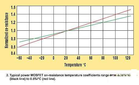對(duì)于開關(guān)MOSFET和同步整流器兩者,都是選擇作為此迭代過程開始點(diǎn)的最大允許裸片結(jié)溫(TJ(HOT))。大多數(shù)MOSFET數(shù)據(jù)參數(shù)頁只給出25°C的最大RDS(ON),,但近來有一些也提供了125°C的最大值。MOSFETRDS(ON)隨著溫度而提高,通常溫度系數(shù)在0.35%/°C至0.5%/°C的范圍內(nèi)(圖2)。如果對(duì)此有所懷疑,可以采用更悲觀的溫度系數(shù)和MOSFET在25°C規(guī)格參數(shù)(或125°C的規(guī)格參數(shù),如果有提供的話)計(jì)算所選擇的TJ(HOT)處的最大RDS(ON):RDS(ON) HOT =RDS(ON) SPEC ×[1+0.005×(TJ(HOT)?TSPEC)]