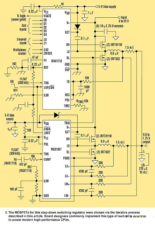 在室溫下組合的最大RDS(ON)為6mΩ,在115°C(假設(shè)的TJ(HOT))為8.7mΩ的兩個(gè)并聯(lián)IRF7811WMOSFET組成開關(guān)MOSFET。組合CRSS為240pF。MAX1718以及MAX1897的1Ω柵極驅(qū)動(dòng)輸出約為2A.。當(dāng)VIN=8V時(shí),電阻損耗為0.57W,而開關(guān)損耗約為0.05W。在20V時(shí),電阻損耗為0.23W,而開關(guān)損耗約為0.29W。在每個(gè)操作點(diǎn)的總損耗大體平衡,而在最小VIN處的最壞情況下,等于0.61W。