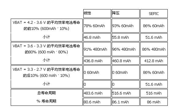 無論DSP 或模擬數字轉換器等數字零件,或是電源管理系統等模擬零件,2G 電話幾乎不提供任何的功能整合,系統設計人員在發展電源管理系統時,通常會以成本和體積為優先考慮,而不是轉換效率。線性穩壓器只能將輸入電壓轉換成更低的輸出電壓,因此電池電壓必須高于3.3V,此時可利用低電流或中電流的線性穩壓器進行電壓轉換,以便提供電力給至2.8V 范圍內的其它電源需求。在3G 芯片組中,基頻處理器現已包含DSP、微處理器/微控制器、模擬數字轉換器和數字模擬轉換器,用來控制射頻訊號和音頻訊號處理。這顆處理器的核心電壓已降至1.2V 或是更低,I/O 和外圍電壓也開始減少至2.5V 至3.0V 范圍;由于3.xG 電話的電流需求通常都超過2.G 電話,3.xG 設計人員需要效率高于線性穩壓器的直流電源轉換器,以便提供更長的電池使用時間。為進一步延長電池壽命,許多設計人員必須盡量利用鋰離子電池電力,直到其電壓降至 最小值為止;在此過程中,如何產生3.3V 電壓就變成一項挑戰。從表面上來看,設計人員若能繼續使用電池直到2.7V,并利用正電源降壓—升壓轉換器或是SEPIC 轉換器提供3.3V 電源,可攜式裝置的電池壽命就會大幅延長,但是根據(表一)針對600mAh 電池所做的簡單分析可發現情形并非如此,因為無論是采用效率更高的降壓轉換器,并將電池使用到3.3V,或是采用SEPIC 之類的轉換器,并將電池電力完全用盡,這兩種方式的供電時間幾乎沒有任何區別。