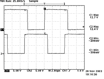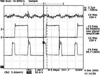 (b)圖中,示意了隔離變壓器副邊輸出的兩路驅(qū)動波形,可以直接驅(qū)動開關(guān)管。從圖中可以看出驅(qū)動波形比較理想:有快速的上升沿,并在一開始有一定的過沖,可以加速開通,減小了開通損耗;同時,有反偏截止電壓,提供了足夠的反相門極驅(qū)動,減小了下降時間;很好地驗(yàn)證了驅(qū)動電路的設(shè)計(jì)是合理的。