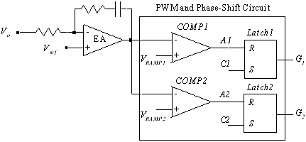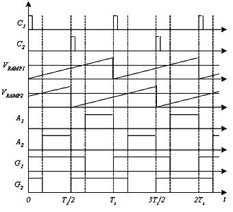 如圖3所示,時鐘信號C1和C2相差180度,它們分別對應(yīng)的鋸 VRAMP1 和 VRAMP2 也相差180度,電壓誤差放大器的輸出信號 VEA、Vo 分別與 VRAMP1 和 VRAMP2 相比較,再通過兩個RS觸發(fā)器得到相差180度的驅(qū)動信號 G1 和 G2 。