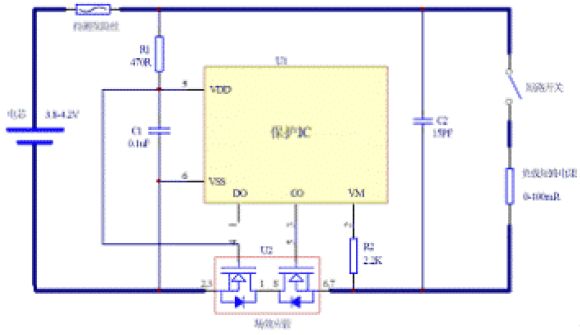 保護IC失效電路示意圖如圖2所示,此時保護IC對短路不能起到保護作用,當負載出現短路時候需要保險絲快速熔斷。