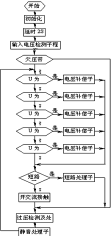 系統(tǒng)接通市電,合上電源開關(guān)后,單片機進行初始化,延時2秒后,進行輸入電壓檢測,若輸入電壓在允許范圍內(nèi),則根據(jù)電壓值進行相應(yīng)的電壓補償,否則補償電路不進行任何動作,但要相應(yīng)的聲光告警;電壓調(diào)整完畢達到輸出標(biāo)準(zhǔn)后,自動合上輸出交流接觸器,系統(tǒng)正常輸出。此時,單片機對輸出電壓進行過壓檢測,一旦輸出電壓過高,則切斷輸出,以防輸出電壓過高而影響負載工作,在電壓恢復(fù)正常后,自動合閘,輸出電壓。單片機還對輸入電壓進行實時檢測,只要市電發(fā)生變化,就進入相應(yīng)的電壓補償子程序,對補償電壓進行調(diào)整。其流程圖見圖5。