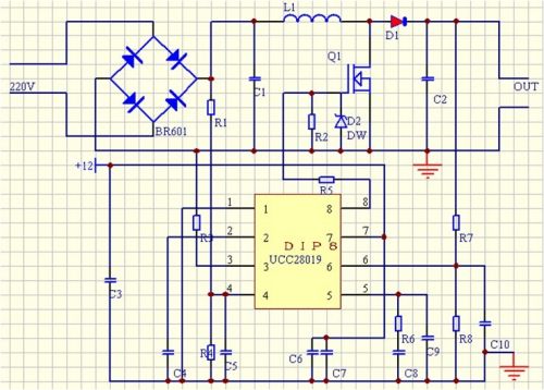 芯片選擇:TI公司的UCC28019可控制功率輸出為100W-2KW,功率因數可提高到0.95,符合設計要求,故此次設計選用該款芯片;
