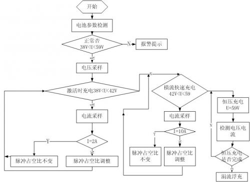 激活充電:充電器開始工作后單片機采集采集蓄電池端電壓檢測,若電壓過低說明曾過度放電,為避免充電電流過大,實行小電流激活。