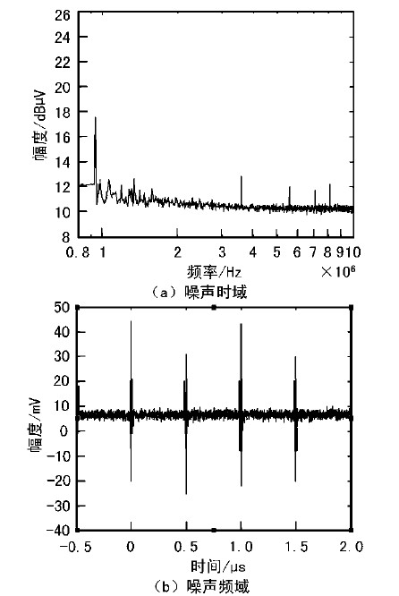 為了測試這種設計,用線性電源(0~32V,5A)來給數字PCB供電。這樣選擇的線性電源不會引入高頻噪聲影響測試結果。直流輸入噪聲的時域和頻域圖如圖1所示。圖1中可以看出,頻率1MHz的噪聲最大,因此EMI濾波器要抑制頻率為1MHz的噪聲。