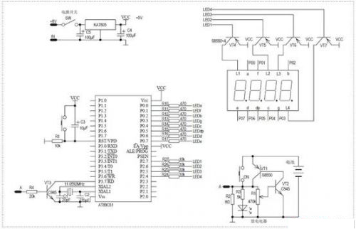 在實際電路中,L1就是第一只數碼管的共陽極端。單片機的輸出、輸入接口數量都很有限,所以4位LED數碼管驅動都是使用動態顯示的方式。4只獨立數碼管LED的內部a、b、c、d、e、f、g、dp這8段發光管相對應的陰極都是并連的。統一由單片機P0口8位輸出進行驅動。數碼管要顯示出數碼還必須在共陽極端同時施加正電壓才行。所以要讓4位中某一數碼管進行顯示,只要在P0口輸出字型碼的同時,給這位數碼管共陽極端加上正電壓就行了,當然與此同時其他三位數碼管的共陽極端要保持低電壓,才不致顯示出現混亂。數碼管共陽極端驅動電流較大,所以采用了三極管進行控制。以第一只數碼管為例,在P0端口輸出字型碼的同時,P37輸出低電平,三極管T4導通,則共陽極端L1就得到高電平了,數字就會顯示在第一只數碼管上了。