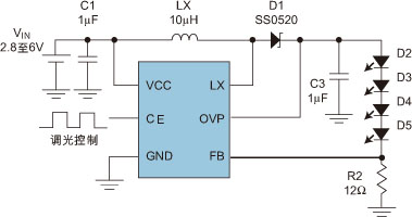圖1:Step-UP DC/DC 開關(guān)電源實(shí)現(xiàn)LED驅(qū)動(dòng)的典型應(yīng)用線路。