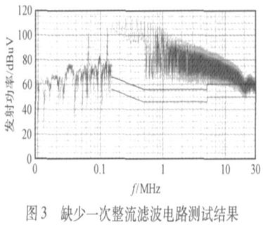 缺少一次整流濾波電路的測(cè)試結(jié)果如圖3所示,從圖3可以看出, 這個(gè)超標(biāo)的頻率點(diǎn)不是單一的而是覆蓋了整個(gè)頻段。為了濾除這些干擾, 將電流的畸變減小到最小, 就需要在整流過(guò)后增加一級(jí)濾波電路。