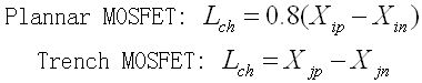 可見閾值電壓主要與基區摻雜濃度(p-)、柵氧化層厚度(Toxg)、耗盡層電荷(Qdep)相關。式中前兩項因子對Trench MOSFET和Plannar MOSFET而言相同,而第三項則不同,因為耗盡層電荷與溝道長度有關,兩者的溝道長度表達式為