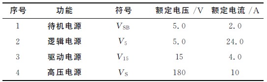 但本文設計的電源只為顯示系統提供大功率180V高壓和+5V 邏輯電壓及+15V 驅動電壓。顯示屏需要的其他高壓又每塊顯示屏的控制電路產生。表1為各種輸出電壓及負載能力表。