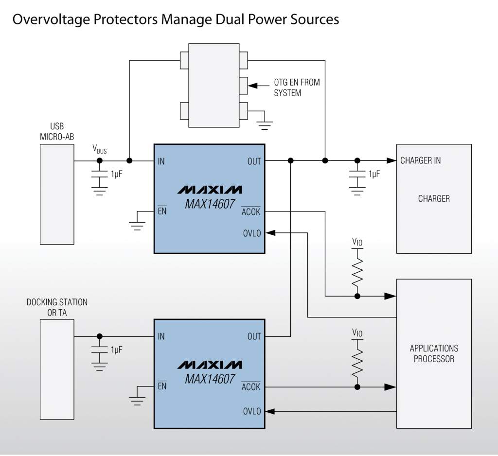 MAX14606/MAX14607的反向偏置電路允許設(shè)備同時連接兩路電源。內(nèi)部兩個背靠背FET避免輸出電壓向輸入端反向供電。反向偏置電路替代多個大體積外部分立元件,為終端設(shè)備提供可靠保護。