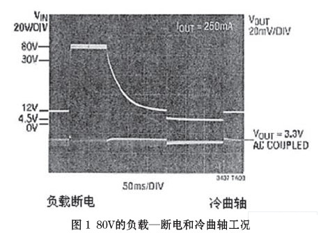 “冷曲軸”(cold crank)段,發(fā)生在汽車發(fā)動機經(jīng)受冷卻或凝固期間,發(fā)動機油變的非常粘滯。因而要求起動機輸出更大的轉(zhuǎn)矩,相繼需要蓄電池提供更大的電流。這一大的電流負(fù)載導(dǎo)致蓄電池/一次母線的電壓降低,甚至低于4V的點火電壓。隨后,又回復(fù)至額定電壓13.8V(圖1)。這在某些應(yīng)用場合,例如發(fā)動電機控制、安全系統(tǒng)和導(dǎo)航系統(tǒng)均不可避免。故要求具有良好調(diào)節(jié)的輸出電壓(一般為3.3V)貫穿“冷曲軸”段,以實現(xiàn)全過程的無間斷(連續(xù))運行。