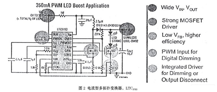 LTC3783是帶恒流PWM調(diào)光的電流型多拓?fù)渥儞Q器(圖2),用于驅(qū)動大功率LED燈串。本項專利技術(shù)可提供非常快而準(zhǔn)確的負(fù)載切換,不會產(chǎn)生瞬時的欠電壓或過電壓,能數(shù)字式達(dá)到3000∶1的調(diào)光率(100Hz),純色的PWM調(diào)光可確保白色LED和紅綠藍(lán)(RGB) LED的顏色完整性。LTC3783利用模擬控制,容許附加100∶1的調(diào)光比,因人眼對周圍光線的變化很敏感,故這一比率必不可少。該多功能的控制器可用于升壓、降壓、升降壓雙向變換器或反激式(Flyback)變換器,或作為恒流/恒壓的調(diào)節(jié)器。利用MOSFET的通態(tài)電阻(on-resistance)可取消傳感電流的電阻器,并提高了效率。LTC3783芯片的應(yīng)用還包括:高電壓LED陣列和LED背光,以及在電訊、自動化與工業(yè)控制系統(tǒng)中的調(diào)節(jié)器。
