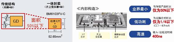 此次羅姆采用獨創(chuàng)的微細加工技術,開發(fā)出片上變壓器工藝,進而成功開發(fā)出小型并且內(nèi)置了絕緣元件的柵極驅(qū)動器。無需外置零件,同時通過采用小型封裝,與傳統(tǒng)產(chǎn)品相比,安裝面積減少了約50%。不僅如此,由于內(nèi)置車載逆變器電路所需的全部保護功能,不僅有助于實現(xiàn)逆變器的小型化,還非常有助于減輕設計負擔。