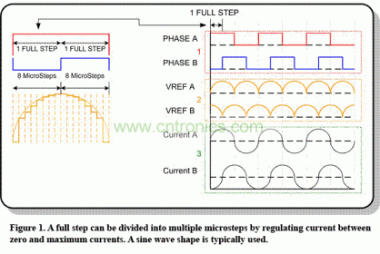 圖 1 通過(guò)調(diào)節(jié)零和最大電流之間的電流,我們可以將一個(gè)全步分成多個(gè)微步。一般會(huì)使用一個(gè)正弦波形。
