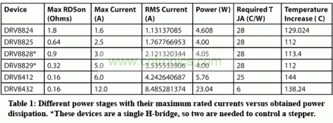 表 1 最大額定電流的不同功率級(jí)對(duì)比得到的功耗。這些器件均為單H橋,因此需要兩個(gè)來(lái)控制一個(gè)步進(jìn)馬達(dá)。