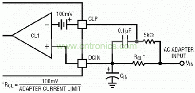 如圖4所示,這個(gè)電路限制充電電流以防止系統(tǒng)功率升高時(shí)交流適配器過載。要設(shè)定輸入電流限制,最重要的就是要最小化墻式配適器的額定電流。限流電阻可以通過下兩式來計(jì)算。