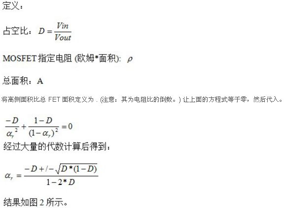 通過圖1,我們知道50%轉換比率時出現最佳傳導損耗極值。但是,在其他轉換比率條件下,可以將損耗降至這一水平以下。附錄給出了進行這種優化的數學計算方法,而圖2顯示了其計算結果。即使在極低的轉換比率條件下,FET芯片面積的很大一部分都應該用于高側FET。高轉換比率時同樣如此;應該有很大一部分面積用于低側。這些結果是對這一問題的初步研究,其并未包括如高側和低側FET之間的各種具體電阻值,開關速度的影響,或者對這種芯片面積進行封裝相關的成本和電阻等諸多方面。但是,它為確定FET之間的電阻比提供了一個良好的開端,并且應會在FET選擇方面實現更好的整體折中。