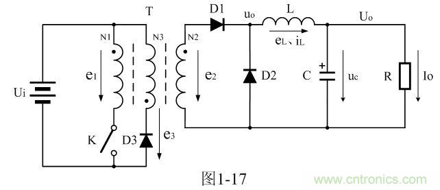 圖1-17是正激式變壓器開關電源的簡單工作原理圖,圖中,Ui是開關電源的輸入電壓,T是開關變壓器,N1、N2、N3分別為開關變壓器的3個線圈繞組,e1、e2、e3分別為3個線圈繞組產生的感應電動勢,K是控制開關,D1是整流二極管,D2是續流二極管,D3是削反峰整流二極管,L是儲能濾波電感,C是儲能濾波電容,R是負載電阻;uo為整流輸出電壓,或濾波輸入電壓、eL為儲能濾波電感產生的感應電動勢、iL為流過儲能濾波電感L的電流、Uo為濾波輸出電壓、Io為流過負載的電流。