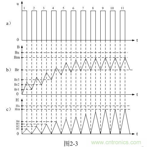 從圖2-3-a)和圖2-3-b)可以看出,每輸入一個直流脈沖電壓,變壓器鐵芯中的磁感應強度B或磁通