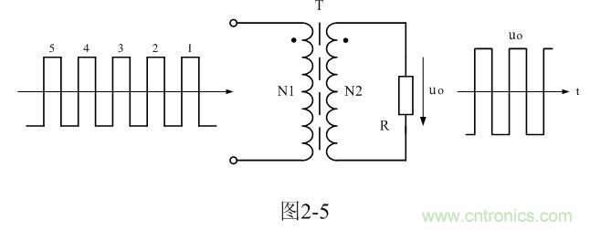 為了簡單起見,我們把雙激式變壓器開關(guān)電源等效成如圖2-5所示電路。圖2-5與圖2-1所示電路的不同之處在于,圖2-1輸入電壓是直流脈沖方波,而圖2-5輸入電壓是交流脈沖電壓方波。因此,圖2-5所示電路與一般的變壓器電路在工作原理上沒有根本的區(qū)別。