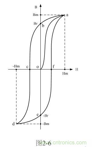 從圖2-6還可以看出,雖然磁感應(yīng)強(qiáng)度被磁場強(qiáng)度磁化的時候可以同時到達(dá)正、負(fù)最大值,但在磁場強(qiáng)度經(jīng)過零的時候,磁感應(yīng)強(qiáng)度與磁場強(qiáng)度總是出現(xiàn)一個相位差。所以,圖2-6中由abcdfa各線段組成的曲線也被稱為磁滯回線,因此,圖2-6也可以稱為雙激式變壓器鐵芯的磁滯回線圖。