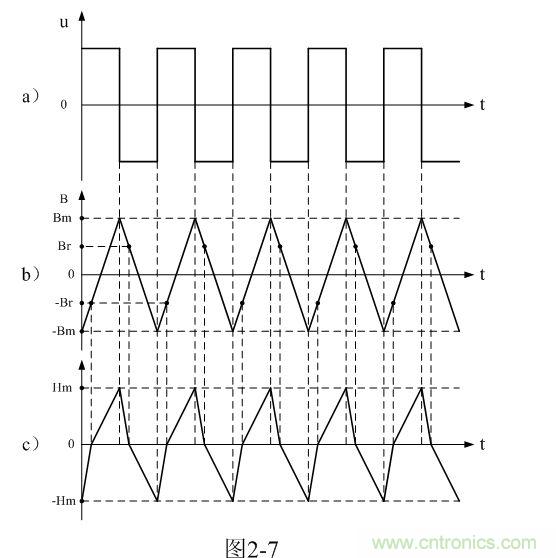 從圖2-7-a)和圖2-7-b)可以看出,每輸入一個交流脈沖電壓,變壓器鐵芯中的磁感應(yīng)強(qiáng)度B或磁通
