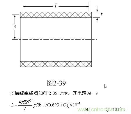 【說明】上式是用來計算多層線圈繞組、截面為圓形的空心線圈的電感計算公式。長岡系數k可查閱表2-1,系數c可查閱表2-2。當線圈內部有鐵芯時,有鐵芯線圈的電感是空心線圈電感的