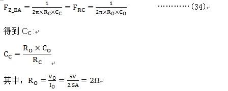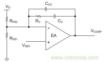 因為電路采取用瓷片電容,所以不用去消除由ESR造成的零點。CCC 不接。 如果采用的是電解電容則需要把反饋電路的極點放到主電路ESR零點附近。可根據(jù)下式計算CCC