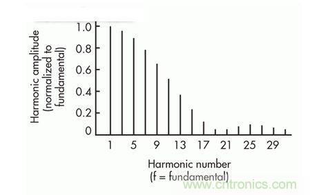 非線性負載可使諧波大小與線路頻率下的基本諧波電流具有可比性。圖4顯示了相對于線路頻率下的基本諧波大小進行標準化的高階諧波電流大小。不過,只有圖1中給出的在與線路頻率相同的頻率下且與電源線電壓同相的諧波電流(在此案例中為線路頻率下的基本諧波)對提供給負載的平均功率起作用。這些諧波電流會影響同一電力線上的其他設備的工作情況。