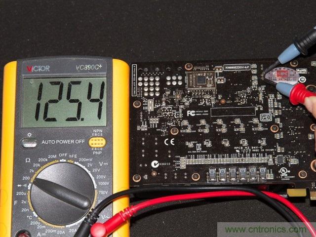 焊接完成后一是要用放大鏡配合電路圖仔細(xì)的測量各個(gè)元器件之間的連接關(guān)系,確定有無短路和虛焊。另外一個(gè)簡單的辦法就是通過直接測量供電回路的電阻值(關(guān)機(jī)狀態(tài)下)來確定是否有明顯的焊接失誤。通常來說GPU核心供電回路的電阻值在1歐姆到10幾歐姆之間,而顯存供電回路則是100-140歐姆左右。至于測量點(diǎn),選擇核心和顯存供電模塊輸出電容的兩個(gè)引腳就可以了。可以看到改造前后核心、顯存供電回路的電阻值都在4.8歐/125歐左右,因此焊接是沒有問題的。