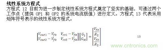 Vcs1 和 Vcs2 可通過方程式 4 確定。請選擇 R2 的值。最佳實踐是選擇已經存在于電源設計中的值,因為這有助于確保網絡穩定性。轉換器的反饋電壓 Vfb 可在穩壓器產品說明書中找到。這樣我們可手動或用數學工具解算線性系統方程式,結果就是 G1 和 GM 電導值。反過來,其結果就是 R1 和 RM。