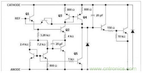 通過TL431 的內部電路,可以看出,Cathode 的電壓不應該低于2.5V。因為只有Cathode 的電壓高于2.5V,Q1 的這個三極管,才可以工作在放大狀態。如果低于2.5V,那么Q1 會進入飽和方式,而失去放大作用。不難看出,此時,Q2、Q3、Q4 等三極管也會失去放大作用而飽和。