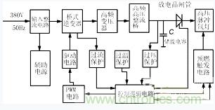 圖1示出電源原理框圖,整個(gè)電路可分為主電路(電力變換電路)和控制電路兩大部分。來(lái)自電網(wǎng)的380V交流電壓經(jīng)整流濾波后得到約520V左右的直流電壓,加到橋式逆變器上。逆變器主功率開關(guān)采用三菱公司的CT60型IGBT管。PWM電路產(chǎn)生一對(duì)相位互差180°的脈沖電壓控制逆變橋的四個(gè)功率管,將直流電壓變換為高頻方波電壓,再經(jīng)高頻高壓整流橋得到高壓直流(約1400V),向儲(chǔ)能電容Co充電。電容Co上電壓充到預(yù)定值(1000V)后,控制電路發(fā)出信號(hào),將放電晶閘管觸發(fā)導(dǎo)通,Co上電壓快速向負(fù)載氙燈釋放,激光器正常工作。