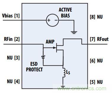 圖:MMIC本身由一個單個的FET共源放大器和一個動態偏壓調制器組成
