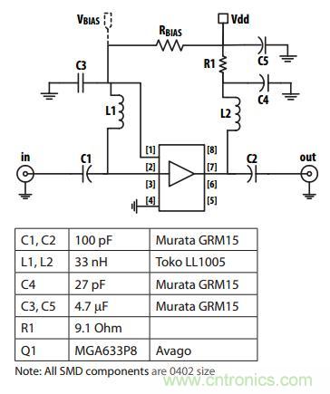 偏壓調整器可以通過改變外部的電壓(Vbias)來調整低噪放的靜態電流(Ids)。其驅動電流(Ibais<1mA)和大多數的CMOS器件相當。可以直接連接到系統的控制器引腳,然后控制低噪放的開關狀態使其應用在時分模式。