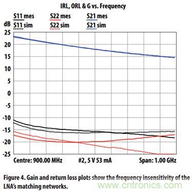 在900MHz,低噪放的噪聲大約為0.3dB,增益大約為18dB,輸入和輸出回波損耗為小于-15dB。另外,在1GHz的帶寬內,回波損耗都可以滿足 這個要求。從系統的角度來說,這個是非常受歡迎的特性。主要是由于傳統的基站需要靠隔離器或者3dB耦合器來滿足系統回波損耗的要求。進一步來說,輸入輸 出匹配的寬帶寬也使得基站的雙工器或者輸入輸出濾波器的使用調試變得簡單,降低了系統的設計復雜度。