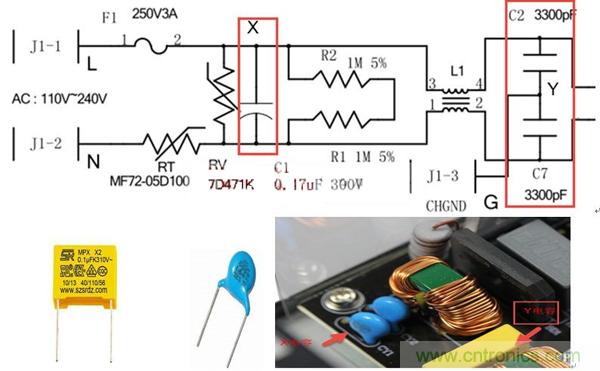 如圖X電容,Y電容。根據IEC 60384-14,安規(guī)電容器分為X電容及Y電容:1. X電容是指跨與L-N之間的電容器, 2. Y電容是指跨與L-G/N-G之間的電容器。