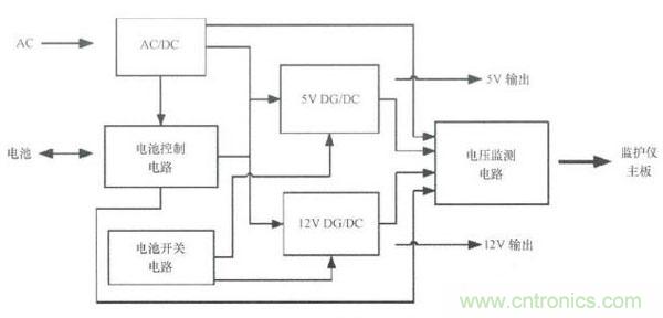 某監護儀的電源部分整體功能框圖見圖2,電源各模塊的功能和關系如下。