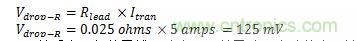 以一個具有25A供電,伴有5A瞬變電流的負載應(yīng)用為例。其中,電源電壓設(shè)為 2.5V,通過5英尺長的14AWG布線連接至IC測試板。由于是低電壓供電,如果電壓有超過100mV的跌落,通常是不可接受的。14AWG線每英尺的電阻為2.5mΩ,由此,在電源輸出和IC測試板之間的導(dǎo)線回路存在25mΩ電阻。根據(jù)歐姆定律,我們可以計算出導(dǎo)向回路上可能出現(xiàn)的壓降: